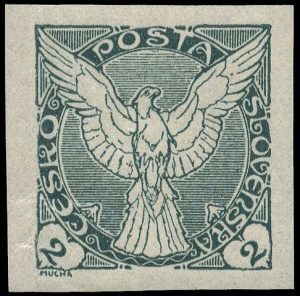 The Hradčany Castle stamps portray the iconic castle in Prague, symbolically depicted with the sun rising behind it, signifying the birth of the new state, even though the sun doesn’t actually rise in that position. These stamps, crafted by the renowned graphic designer Alphonse Mucha, an advocate of Art Nouveau residing in Prague, were selected from a pool of more than ten designs. Mucha’s choice of the castle motif was driven by his belief that every nation has its own palladium representing past and future history. He found a powerful interpretation of this symbol in the architectural lines of St. Vitus Cathedral, located near the castle. According to Mucha, there was no other subject more fitting for his design than Hradčany Castle and the surrounding medieval architecture.